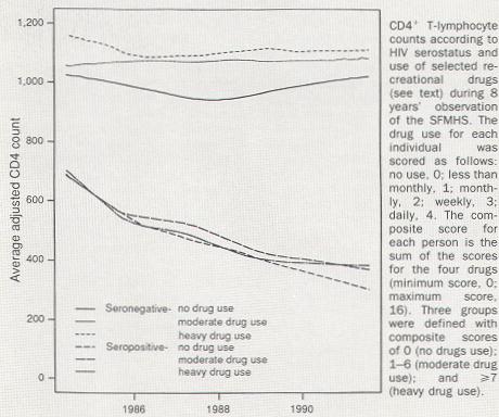 Observational studies of HIV-infected individuals have found that drug use does not accelerate progression to AIDS (Kaslow et al., 1989; Coates et al., 1990; Lifson et al., 1990; Robertson et al., 1990). In a Dutch cohort of HIV-seropositive homosexual men, no significant differences in sexual behavior or use of cannabis, alcohol, tobacco, nitrite inhalants, LSD or amphetamines were found between men who remained asymptomatic for long periods and those who progressed to AIDS (Keet et al., 1994). Another study, of five cohorts of homosexual men for whom dates of seroconversion were well-documented, found no association between HIV disease progression and history of sexually transmitted diseases, number of sexual partners, use of AZT, alcohol, tobacco or recreational drugs (Veugelers et al., 1994).
